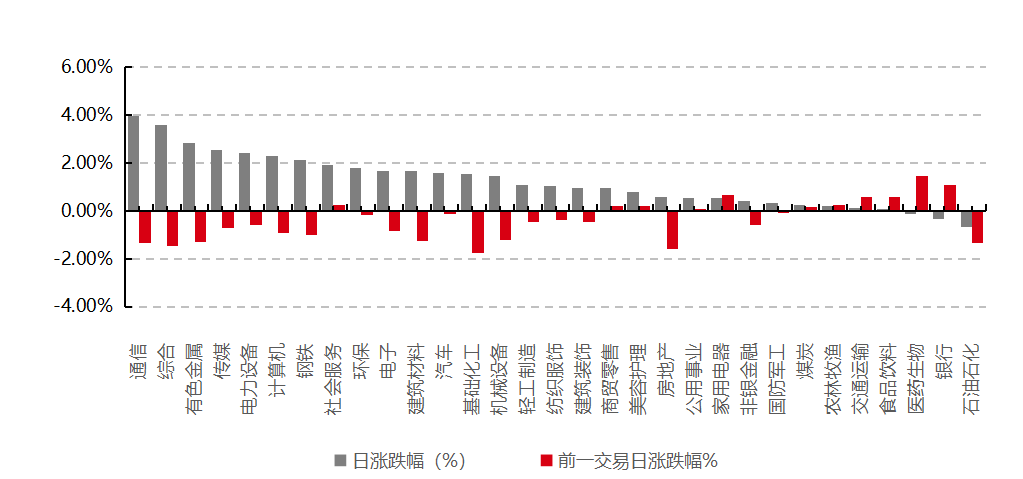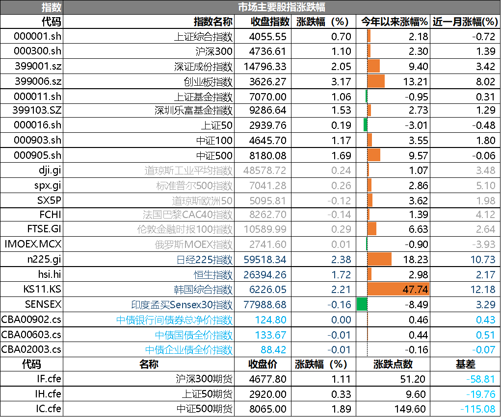 31個(gè)申萬一級(jí)行業(yè)中有28個(gè)行業(yè)上漲。其中,通信、綜合、有色金屬表現(xiàn)居前,漲跌幅分別為3.97%、3.60%、2.83%,醫(yī)藥生物、銀行、石油石化表現(xiàn)居后,漲跌幅分別為-0.11%、-0.35%、-0.67%。滬市有1727只個(gè)數(shù)上漲,占比74.83%,深市有2334只個(gè)數(shù)上漲,占比80.90%。非ST個(gè)股中,81只個(gè)股漲停,4只個(gè)股跌停。股指期貨主力合約3個(gè)合約均上漲,其中,3只期指好于現(xiàn)貨指數(shù)。